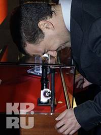 Как известно, Левша умер, так и не сумев пробиться через бюрократию и донести до главы государства в общем-то не трудную для понимания мысль: «Скажите государю, что у англичан ружья кирпичом не чистят: пусть чтобы и у нас не чистили, а то, храни Бог войны, они стрелять не годятся…”»[5]. И хотя «собственная канцелярия» ведева работает так же скверно (конечно если соотноситься с задачей селекции общественно значимой информации из потока вздора и мелочёвки, а не с задачей поддержания режима самодовольства и разрушения России в интересах «передового» Запада[6]), как и канцелярия, не доложившая государю рекомендацию Левши об обращении с ружьями, ведев вспомнил Левшу и в Тульском музее оружия рассматривал в микроскоп (фото слева) настоящую засушенную блоху, подкованную в 2002 г. одним из тульских умельцев наших дней.