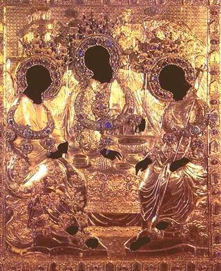 · Справа: фотография золотого оклада для этой иконы — дара Бориса Годунова Троице-Сергиевой лавре.[24]