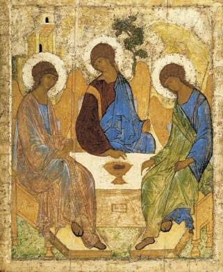 · Слева: репродукция иконы письма Андрея Рублёва «Троица» как она есть.