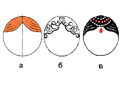 Эффектно смотрятся «рыжие матрешки», особенно накинувшие черный или белый платок. В этом случае пряди лучше выделить краской какого-либо коричневого цвета и обойтись без кудрей. Волосы матрешки эффектно украсить «жемчугом», расположив его в З ряда (рис. 3,в).