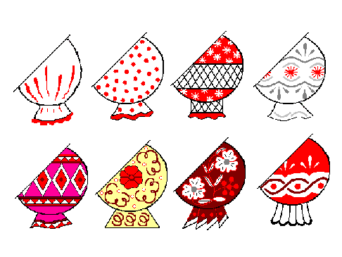На белом фоне рукава хорошо смотрятся самые разнообразные узоры. И сложность их зависит от того, какой у вас навык в рисовании. На рис. 4 изображены несколько различныхпо сложности выполнения вариантов узора. Наверняка фантазия подскажет вам и какие-либо другие рисунки, более оригинальные и легкие в исполнении. Линии орнамента лучше выполнять синей или черной краской кистью № 1. Кстати, не обязательно рисовать белый рукав, он может быть любого цвета (в соответствии с костюмом вашей матрешки).