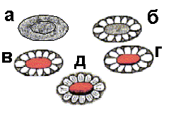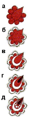 Для этого нанесите на некотором расстоянии друг от друга 3... 5 овалов (рис.9). Затем в каждый из них впишите еще по одному овалу меньшего размера (рис. 10,а) и белой краской аккуратно нанесите лепестки. Когда подсохнут, закрасьте серединку цветков желтым цветом (рис. 10,в). Чтобы придать ромашке объемность, проведем по нижнему краю сердцевинки охрой полоску (рис. 10, г). После этого обведем нижний край тоненькой линией коричневой краской (кисть № 1) и нанесем точки-тычинки: (рис. 10, д.). Ромашка готова! Оставшееся свободное пространство на сарафане заполним листьями и бутонами, причем листья уже не нужно так тщательно выписывать, достаточно обозначить их легкими мазками.