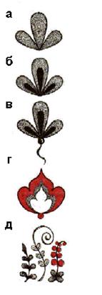 Теперь пришла очередь лепестков. Самый простой вариант лепестков — трилистник (рис. 7). Сначала зеленой краской полностью закрасим лепестки, а когда краска высохнет, выделим серединку каждого лепестка черным цветом и снова ждем, когда краска подсохнет. После этого поставим крупную точку у основания лепестка: так он выглядит законченным. На рис. 7, г представлен более сложный листок. Его лучше выполнить «бронзянкой», а середину выделить черной краской. Теперь внимательно посмотрите на расположение цветов и листьев на платке. Несомненно, кое-где остались незаполненные ничем места с «голым фоном». Но не расстраивайтесь, этот недостаток легко исправить с помощью всевозможных веточек, елочек, приведенных, например, рис. 7, д. Ну вот, платок и приобрел товарный вид!