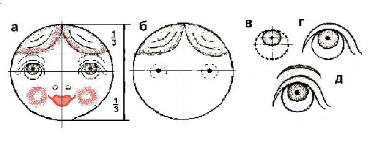Чтобы правильно расположить элементы лица, осторожно нанесем карандашом на оставленном для лица круге 2 горизонтальные линии (рис. 11,а). Верхнюю часть круга будут занимать волосы, в средней части расположатся глаза, а в нижней части — губы и румянец.