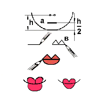 Сначала нарисуем контур губ, это самое главное. Разделим расстояние от носа до нижнего контура лица пополам. На этом уровне нарисуем горизонтальную линию (рис 12, а, б), затем «бантик» (рис 12 в) и нижний контур губ (рис. 12, г). Раскрасим губы красной краской. Если кончиком кисти слегка приподнять вверх уголки губ, матрешка вам «улыбнется». На рис. 12 приведены варианты формы губ. Румянец обычно с помощью спички и ваты делают акварелью или румянами из косметического набора. «Загорается» он на одном уровне с линией губ.