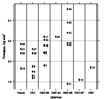 Техника количественной цитохимии. Были использованы мазки костного мозга 28 пациентов Российской детской клинической больницы от 3 до 15 лет (15 мужского пола, 13 женского). Из них 4 с нормальным костным мозгом, 8 с острым лимфолейкозом (ОЛЛ), 7 с острым промиелоцитарным лейкозом (ОМЛ М3), 1 с острым миеломоноцитарным лейкозом (ОМЛ М4) с эозинофилией, 6 с острым моноцитарным лейкозом (ОМЛ М5), 1 с острым мегакариоцитарным лейкозом (ОМЛ М7), 1 с бластным кризом хронического миелолейкоза (ХМЛ) по М5-типу. У пациентов с лейкозами доля бластов в костном мозге составляла 76–92%.