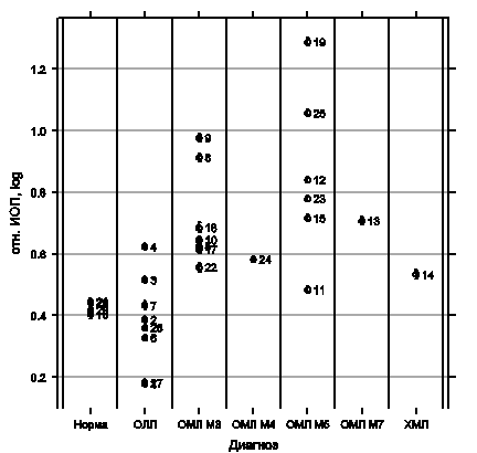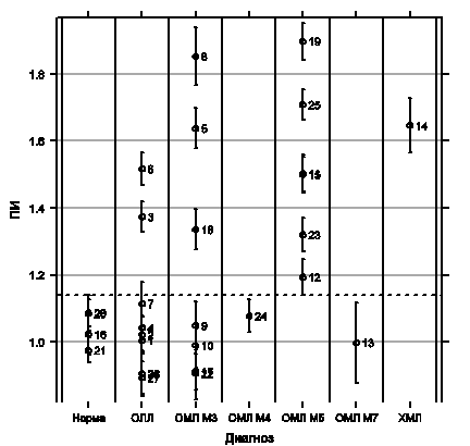 Таким образом, хотя наличие ингибитора, по-видимому, не влияет на окрашивание эритроцитов, их средняя ИОП воспроизводится плохо. Подобным образом ведёт себя и ИОП лейкоцитов: ПИ, вычисленный без нормировки, имеет большой разброс и почти не выявляет различий между ОЛЛ, ОМЛ М3 и ОМЛ М5. Более того, у пациента 22 ИОП бластов на препарате с NaF оказалась достоверно выше! Если же поделить ИОП лейкоцитов на среднюю ИОП эритроцитов того же препарата, сразу выделяется группа точек вокруг значения 1,0, отвечающая случаям неингибируемой НЭ (рис. 4), все пациенты с ОМЛ М5 имеют высокий ПИ в полном соответствии с данными литературы, и достоверные случаи «повышения» активности по действием NaF отсутствуют.