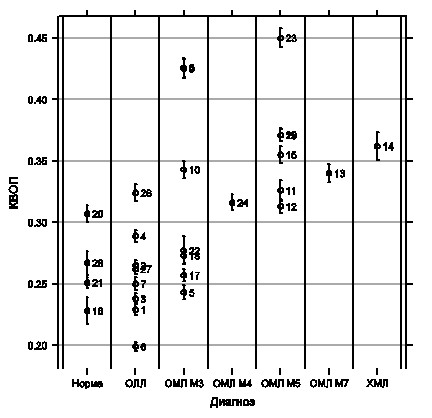 Достоверность отличий в средних значениях характеристик при разных патологиях оценивалась с помощью критерия Вилкоксона.