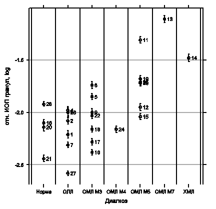 Также интересно наличие одного случая ОЛЛ с достаточно высокой отн. ИОП. Данный случай, сходный с ОМЛ М5, можно отличить уже на основе реакции на НЭ по отсутствию ингибирования и по низкой степени гранулярности.