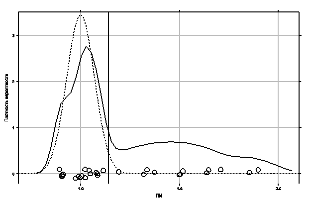 Рис. 4. Распределение ПИ в исследованных образцах. Каждый кружок соответствует одному пациенту. Сплошная кривая — ядерная оценка плотности распределения ПИ. Пунктирная кривая — плотность нормального распределения со средним 1,0 и СО 0,07. Вертикальная прямая проходит через значение 1,14.
