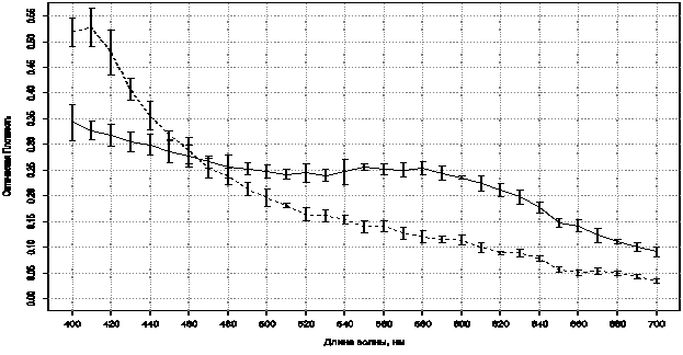 Спектр соли диазония, применявшейся при реакции на НЭ (рис.5), имеет почти постоянную ОП от 480 до 600 нм, что оправдывает использование зелёного канала цветной видеокамеры для количественной оценки этой реакции, поскольку докраска гематоксилином в этом случае не производилась.