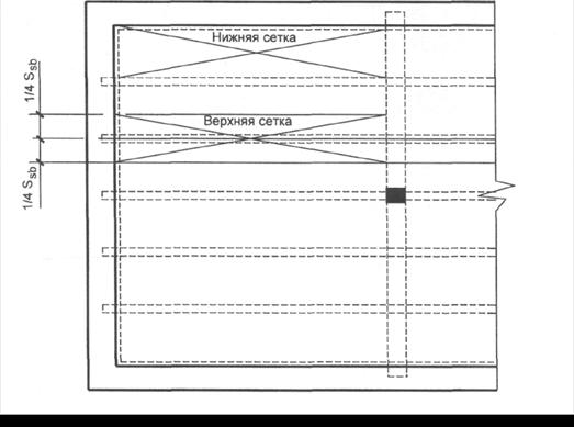 При раздельном армировании (рис. 12) длина и ширина нижних сеток зависит от размеров ячеек в свету. Верхние сетки располагаются над второстепенными балками и заводятся на 1/4