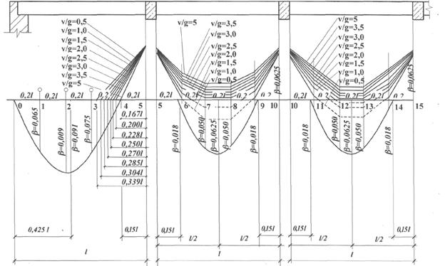 Огибающая эпюра моментов (см. рис. 15) строится в зависимости от сотношения v/g по рис.14 и табл. 5.