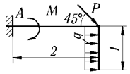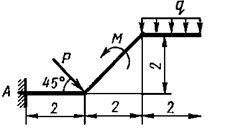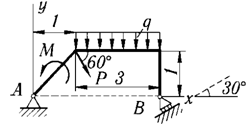 На схемах (таблица 3.2) показаны механические системы, состоящие из конструкции и ударяющего по ней тела. Конструкция может вращаться вокруг оси, проходящей через неподвижную точку О. Она состоит из тонких однородных стержней 1 и 2, или однородной пластины 3 и точечных грузов 4. Масса 1 м длины стержней равна 25 кг, масса 1 м2 площади пластины - 50 кг, масса точечного груза - 20 кг. Размеры частей конструкции указаны в метрах.