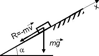 Тело массой m = 15 кг поднимается по гладкой наклонной плоскости, составляющей угол α = 30°с горизонтом, получив начальную скорость v0 = 10 м/с. Сопротивление среды пропорционально скорости