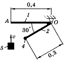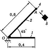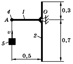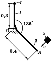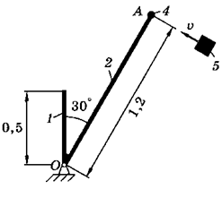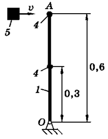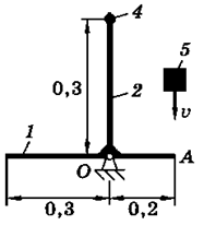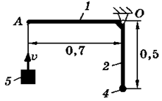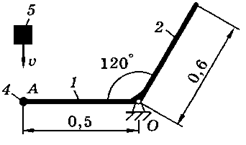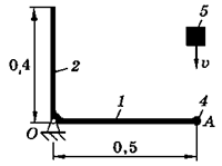 Тело 5 (материальная точка) массой m5 = 30 кг, двигаясь со скоростью v = 4 м/с, ударяется о неподвижную конструкцию в точке А, причем удар является абсолютно неупругим.