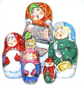 5. Совершенно новым явлением в росписи русской матрешки является так называемая политическая матрешка, которая представляет собой целую галерею русских царей, российских и зарубежных государственных, общественных деятелей. Роспись матрешек, изображающих современных политиков, носит несколько шаржированный характер. К типу политической матрешки можно отнести матрешки, воспроизводящие образцы популярных артистов, спортсменов.