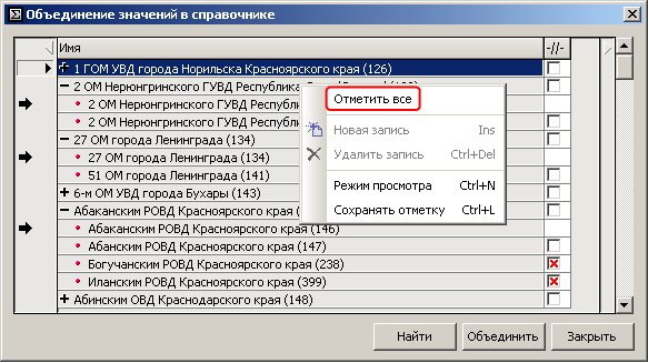 Объединение произвольных значений справочника выполняется следующим образом: откройте справочник, выделите значения, которые необходимо объединить, установите маркер «1» для того значения, на которое будет выполняться объединение, воспользуйтесь командой контекстного меню «Объединить».