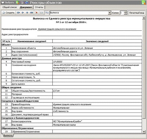 6.4. Печатная форма «Выписка из Единого реестра муниципального имущества»
