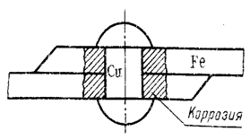 Электрохимическая коррозия. Является электрохимической реакции, происходящий при контакте одного метала с другим, более благородным металлом в присутствие какой либо коррозионно-активной среды и электролита. Если между двумя металлами образуется электрическая цепь, более активный металл становится анодом, а более благородный металл - катодом. Развитие коррозии в результате контакта разных металлов можно иллюстрировать схемой, представленной на рис. 1.