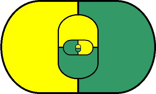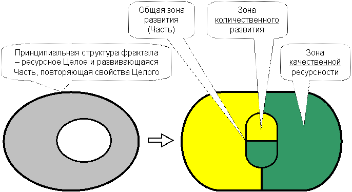 Необходимо обратить внимание на такое свойство фрактала, обладающего количественной и качественной характеристиками, как симметричность, зеркальность его построения. Тотальная часть разделена на две зоны, и локальная часть разделена на две зоны. И в данном случае ресурсная часть выступает в роли фрактала первого порядка, а развивающая часть – фракталом второго порядка.