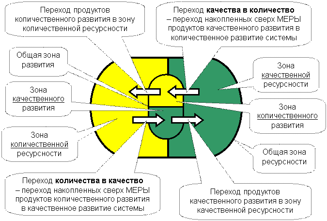 Переходы «2» и «4» (обозначены более светлыми стрелками) управляются диалектическим Законом перехода количественных изменений в качественные, а качественных – в количественные. Или, точнее, Законом развития качества через превышение меры количественной ресурсности (переход «4»), и развития количества через превышение меры качественной ресурсности (переход «2»).