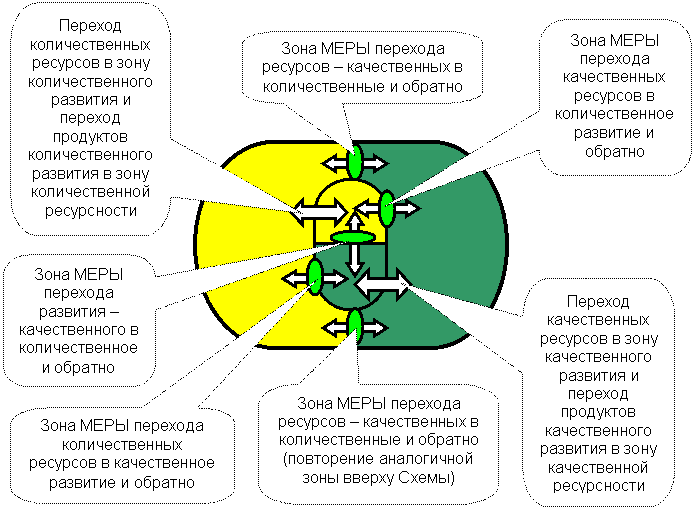 На Схеме (Рис 17) стрелками показаны диалектические переходы при развитии системы. Однако, согласно диалектике, переходы между количеством и качеством через зону превышения МЕРЫ могут происходить в обе стороны – это, во-первых. А во-вторых, переходы между зонами развития и ресурсности (как качественными, так и количественными) представляют собою строго регулируемую «улицу с двусторонним движением»: в зону развития идут ресурсы, а в зону ресурсов – продукты развития.