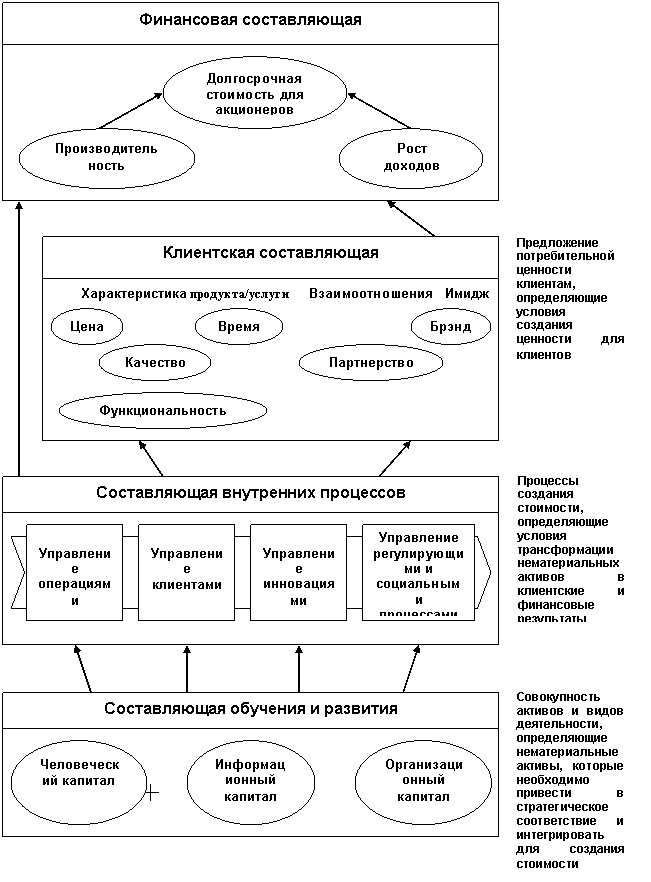 Расположение составляющих не случайно. Оно отражает общую концепцию создания стоимости в информационную эпоху. Финансовые результаты создаются факторами клиентской составляющей. Факторы клиентской составляющей являются результатами факторов составляющей внутренних процессов, а те, в свою очередь, результатами факторов составляющей обучения и роста. В общем виде Стратегическая карта выглядит следующим образом (Рис. 17).