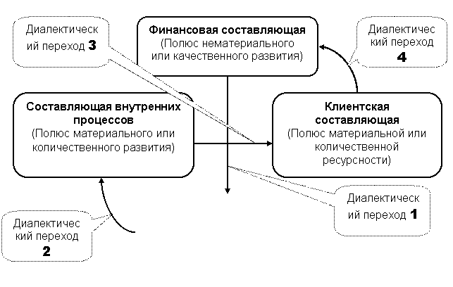 На Схеме (Рис. 19) мы видим, что первым диалектическим этапом перехода является инвестирование средств в нематериальные активы, которыми располагает компания – составляющую обучения и развития. Затем происходит запуск материального, количественного развития – составляющая внутренних процессов, что представляет собой второй этап диалектического перехода. На этом этапе происходит процесс материализации нематериальных активов. Результаты процесса количественного развития в рамках клиентской составляющей – преобразуются в материальные ресурсы, что и показывает третий этап диалектического перехода. И, наконец, на четвертом этапе диалектического перехода количественного развития в качественное происходит процесс трансформации материальных активов в нематериальные. Это осуществляется финансовой составляющей, после чего начинается новый цикл преобразований, но уже на новом качественном уровне.