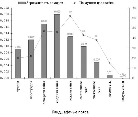 Рисунок 2. Зараженность комаров и иммунная прослойка среди населения к вирусам серокомплекса Калифорнийского энцефалита в различных ландшафтных поясах на севере России. |