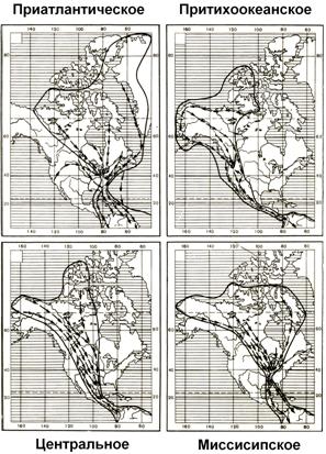 Вот почему мы были готовы для анализа причин резкого обострения заболеваемости людей на юге России в гг. за счёт энцефалита Западного Нила, хотя первоначально эта инфекция была идентифицирована местными специалистами как энтеровирусная. В тот же период при загадочных обстоятельствах аналогичная вспышка возникла в Нью-Йорке и за короткий срок охватила всю Америку за счёт распространения вируса по основным миграционным руслам птиц – Атлантическому, Миссисипскому, Центральному и Тихоокеанскому (рис. 6).