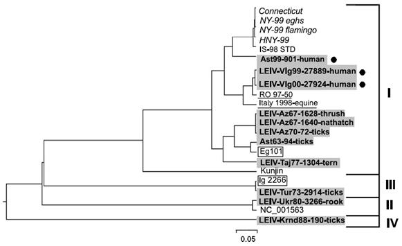 Рисунок 8. Филогенетический анализ полноразмерных геномов исторических и эпидемических штаммов вируса Западного Нила: генотипы обозначены римскими цифрами; топотипные штаммы заключены в рамку; на сером фоне приведены исторические штаммы с территории бывшего СССР; актуальные эпидемические штаммы из Европы подчеркнуты; российские актуальные эпидемические штаммы отмечены черной точкой справа. |