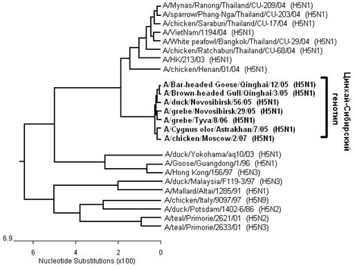 Летом прошлого года (2006 г.) на озере Убсу-Нур, что на границе Республики Тува и Монголии, возникла эпизоотия с гибелью более трёх тысяч диких птиц только на российской части акватории, составляющей 0,1 % от всей площади озера. Всего же погибло по нашим расчётам порядка ста тысяч птиц. За полтора года со времени Цинхайской вспышки в Китае вирус, скрывавшийся где-то в популяциях диких птиц, опять проявил свою агрессивность, ничуть не снизив вирулентность, как показали наши данные его молекулярно-генетического изучения (рис. 9).