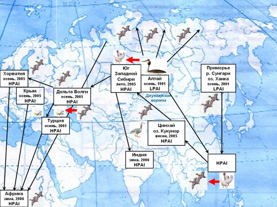 Итак, как и когда проник высокопатогенный грипп Н5 на территорию России, и какова перспектива дальнейшего развития событий (см. рис. 10). Сначала низкопатогенные штаммы из Сибири и Дальнего Востока с дикими птицами были занесены в последние годы во время осенних миграций в места зимовок в страны Юго-Восточной Азии. Там они в популяциях домашних птиц превратились в высокопатогенные и с дикими же птицами весной 2005 года через «Джунгарские ворота» (между горными системами Тянь-Шаня и Монгольского Алтая) проникли в Западную Сибирь и резко активизировались в период появления молодняка птиц. А затем произошёл эпизоотический взрыв после попадания вируса в популяции домашних птиц. Высокопатогенные штаммы разлетелись с птицами в места гнездовий на территории более 10 млн. км2 вплоть до побережья Ледовитого океана. Третий наш прогноз заключался в том, что когда осенью птицы полетят обратно в места зимовок через густонаселённые территории России и других стран, они вновь разнесут вирус. И этот прогноз подтвердился. Вирус осенью 2005 г. уже долетел до Африки, большинства европейских стран, Крыма, Ирана, Индии, Пакистана, Азербайджана, Грузии, Турции, где выявлена заболеваемость людей со смертельным исходом.