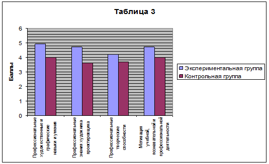 Подводя итоги, зафиксированные в таблице, можно констатировать, что профессиональные качества выпускников в области художественных, графических, проектных знаний, умений и навыков в ходе эксперимента возросли на 1,4 балла.