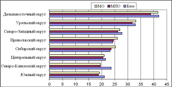 Федеральный округ | Надбавка базовая | Надбавка МПО | Надбавка МО | % Надбавка (МО-база)/ база | % Надбавка (МПО - база)/ база | % Надбавка (МО-МПО)/ МПО |
