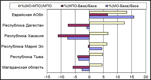 Субъект Российской Федерации | % (МО-База)/База | % (МПО-База)/База | % (МО-МПО)/ МПО |