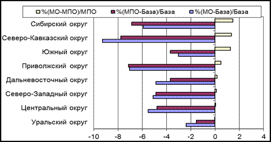 Федеральный округ | % (МО-База)/База | % (МПО-База)/База | % (МО-МПО)/МПО |