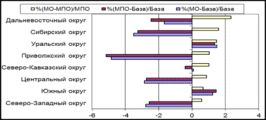 Федеральный округ | % (МО-База)/База | % (МПО-База)/База | % (МО-МПО)/МПО |