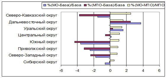 Федеральный округ | % (МО-База)/База | % (МПО-База)/База | % (МО-МПО)/МПО |
