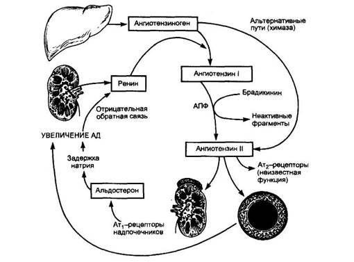 Роль AT II в патогенезе ГБ исключительно велика, так как, кроме прямого прессорного влияния, он обусловливает развитие и других патологических процессов — гипертрофию и фиброз миокарда левого желудочка, гипертрофию гладких мышечных волокон сосудов, способствует развитию нефросклероза, повышению реабсорбции натрия и воды, высвобождению катехоламинов из мозгового слоя надпочечников. Весьма существенно, что, кроме повышения уровня AT II в кровяном русле, повышается его содержание в тканях, так как существуют так называемые тканевые ренин-ангиотензиновые системы. Наконец, кроме классического пути образования AT путем воздействия АПФ на AT I, существуют так называемые альтернативные пути, когда AT I превращается в AT II с помощью других ферментов (например, химазы), а также нерениновый путь образования AT И.