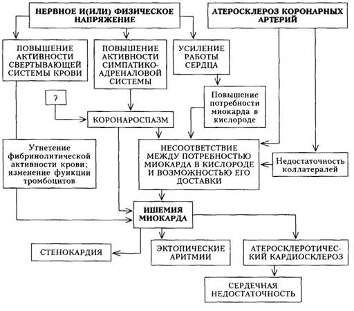 При атеросклерозе коронарных артерий несоответствие потребностей миокарда в кислороде возможностям коронарного кровообращения (схема 14) ярко проявляется при физической нагрузке (усиление работы сердца, повышение активности симпатико-адреналовой системы). Выраженность коронарной недостаточности усугубляется недостаточностью коллатеральных сосудов, а также внесосудистыми влияниями на коронарные артерии. К таким влияниям относятся сжимающий эффект миокарда на мелкие коронарные артерии в фазу систолы, а также повышение внутримиокарди-ального давления в связи с развивающейся во время приступа стенокардии недостаточностью сократительного миокарда и увеличения конечного диастолического объема и давления в левом желудочке.