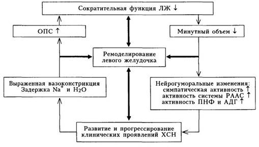 Ангиотензин II стимулирует также увеличенное образование альдо-стерона, что в свою очередь повышает реабсорбцию натрия, увеличивает осмолярность плазмы крови и в конечном счете способствует активации продукции антидиуретического гормона (АДГ) — вазопрессина. Повышение содержания АДГ и альдостерона приводит к прогрессирующей задержке в организме натрия и воды, увеличению массы циркулирующей крови, повышению венозного давления (что также обусловливается констрикцией венул). Происходит дальнейшее увеличение венозного возврата крови к сердцу, в результате чего дилатация левого желудочка усугубляется. Ангиотензин II и альдостерон, действуя местно в миокарде, приводят к изменению структуры пораженного отдела сердца (левого желудочка) — к так называемому ремоделированию. В миокарде происходит дальнейшая гибель миокардиоцитов и развивается фиброз, что еще больше снижает насосную функцию сердца. Сниженный сердечный выброс (точнее, фракция выброса) ведет к увеличению остаточного систолического объема и росту конечного диастолического давления в полости левого желудочка. Дилатация еще больше усиливается. Это явление поначалу, согласно механизму Франка —Старлинга, приводит к усилению сократительной функции миокарда и выравниванию сердечного выброса. Однако по мере прогрессирования дилатации механизм Франка—Старлинга перестает работать, в связи с чем возрастает давление в вышележащих отделах кровеносного русла — сосудах малого круга кровообращения (развивается гипертензия малого круга кровообращения по типу «пассивной» легочной гипертензии).