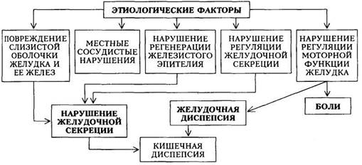 Под влиянием различных этиологических факторов и при участии сопутствующих происходит ряд функциональных и морфологических изменений желудка, что проявляется секреторными и моторными нарушениями, находящими свое отражение в клинической картине болезни. Предполагается, что первоначально возникают функциональные расстройства секреции и моторики желудка. В дальнейшем к функциональным изменениям присоединяются органические; так, в частности, избыток ионов водорода при гиперсекреции соляной кислоты угнетает активность сульфатазы (фермент, ответственный за поддержание нормальных соотношений компонентов желудочного сока), результатом чего является дальнейшее нарушение желудочной секреции (подавление) и повреждение эпителиальных структур слизистой оболочки желудка с последующим нарушением регенерации. Этому способствуют моторно-эвакуаторные нарушения, в результате которых содержимое двенадцатиперстной кишки попадает в желудок. Секрет поджелудочной железы и желчные кислоты, входящие в состав этого содержимого, воздействуют повреждающе на слизистую оболочку.