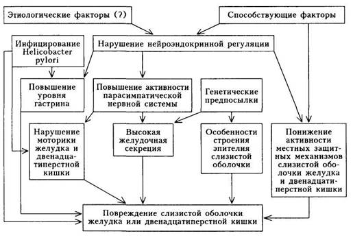 Предполагают, что под воздействием неуточненных и известных этиологических факторов происходит нарушение нейроэндокринной регуляции секреторной, моторной, инкреторной функций желудка и двенадцатиперстной кишки с повышением активности парасимпатического отдела вегетативной нервной системы (схема 17).