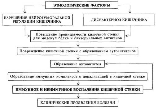 Этиология. Точных сведений о причине развития болезни в настоящее время нет. Придают значение инфекционным факторам, в том числе дисбактериозу, воздействию протеолитических и муколитических ферментов, пищевой и бактериальной аллергии.