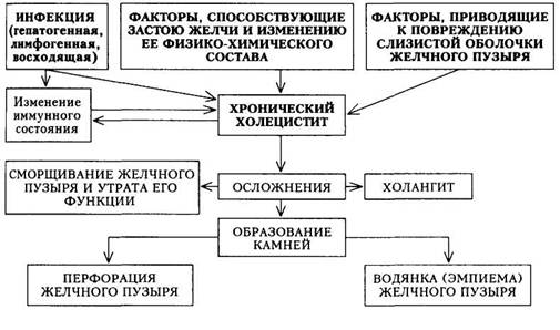 В патогенезе ХБХ имеют значение также факторы, приводящие к повреждению стенок желчного пузыря с травматизацией его слизистой оболочки, нарушением кровообращения и развитием воспаления. У ряда больных ХБХ первично происходит повреждение слизистой оболочки желчного пузыря при нарушенном оттоке желчи, а инфекция присоединяется вторично.