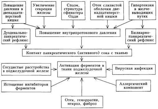 При заболеваниях желчных путей возникает рефлюкс желчи в проток поджелудочной железы, вследствие чего происходит «внутрипротоковая» активация ферментов. Рефлюкс может сочетаться с повышением внутри - протокового давления вследствие патологии сфинктера Одди. Сама по себе внутрипротоковая гипертензия повреждает базальные мембраны аци-нусов, что облегчает процесс самопереваривания.