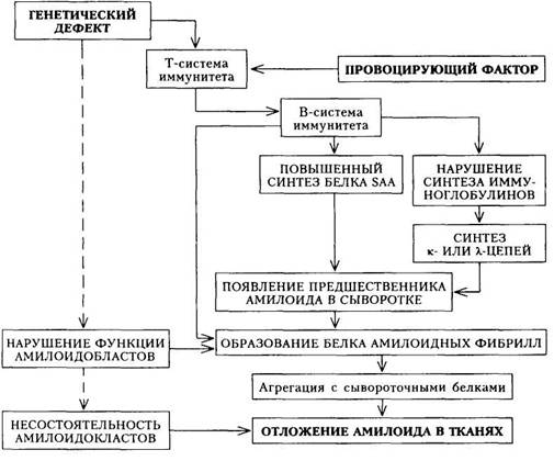 количество Т-лимфоцитов. Это приводит к снижению контролирующего их воздействия на В-систему лимфоцитов. В результате уменьшается количество В-клеток, несущих нормальные иммуноглобулины, и увеличивается количество В-клеток, синтезирующих предшественников амилоидной фибриллы. Амилоидобласты в повышенном количестве продуцируют фибриллярный белок, что обусловливает синтез амилоида в большом количестве.