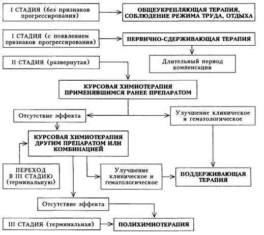 В развернутой стадии проводится курсовая химиотерапия. Используют тот же препарат, но в больших дозах (ежедневно 2 — 3 приема) под гематологическим контролем: при снижении количества лейкоцитов и тромбоцитов дозу препарата уменьшают, а при содержании лейкоцитов 10 —20109/л и тромбоцитов 100-109/л препарат отменяют. Если ранее эффективные препараты не оказывают действия в течение 3 — 4 нед, то следует провести курс лечения другим цитостатиком. Так, если гид pea оказывается неэффективной, то назначают миелосан (бусульфан, милеран), миелобромол.